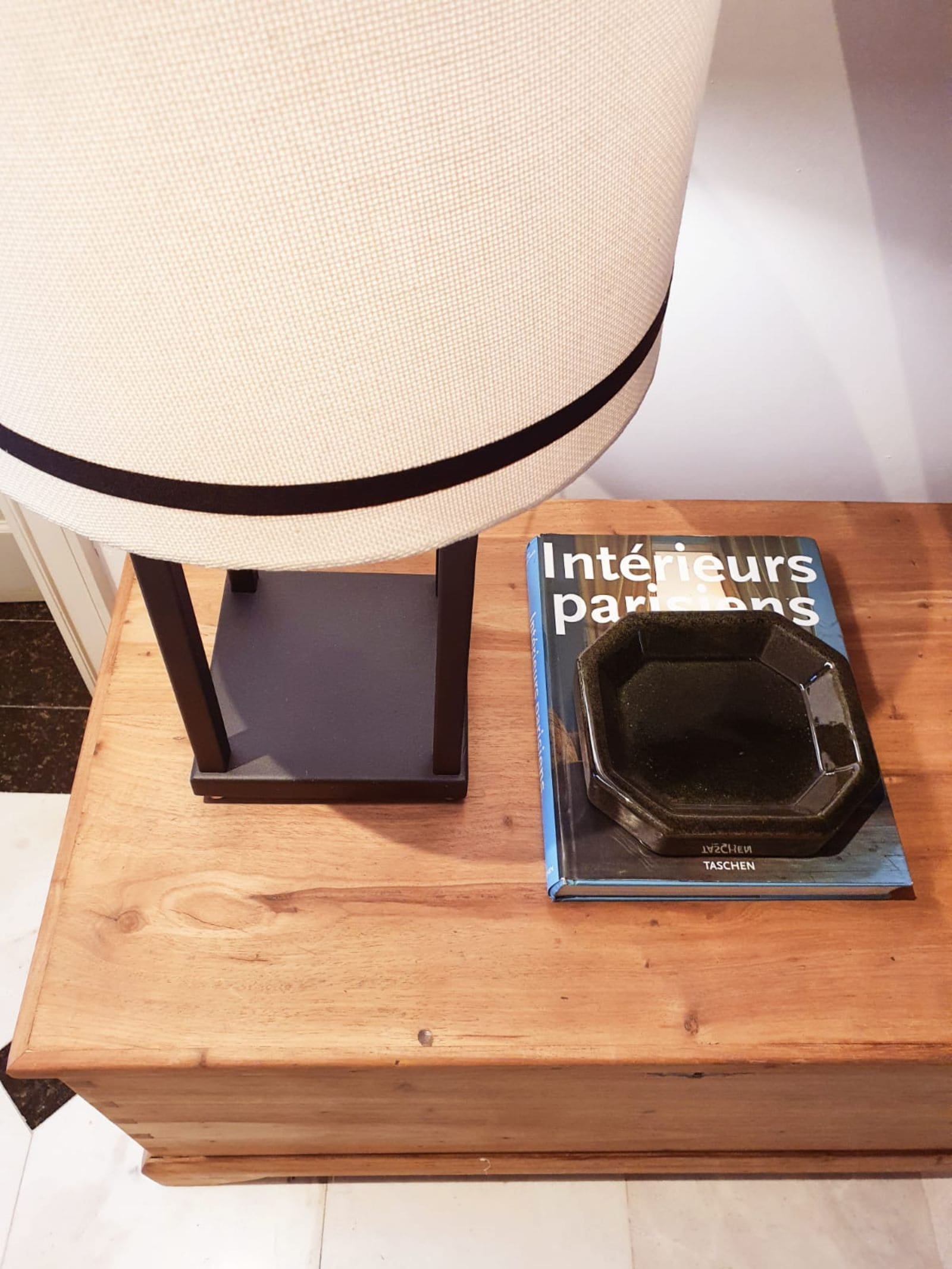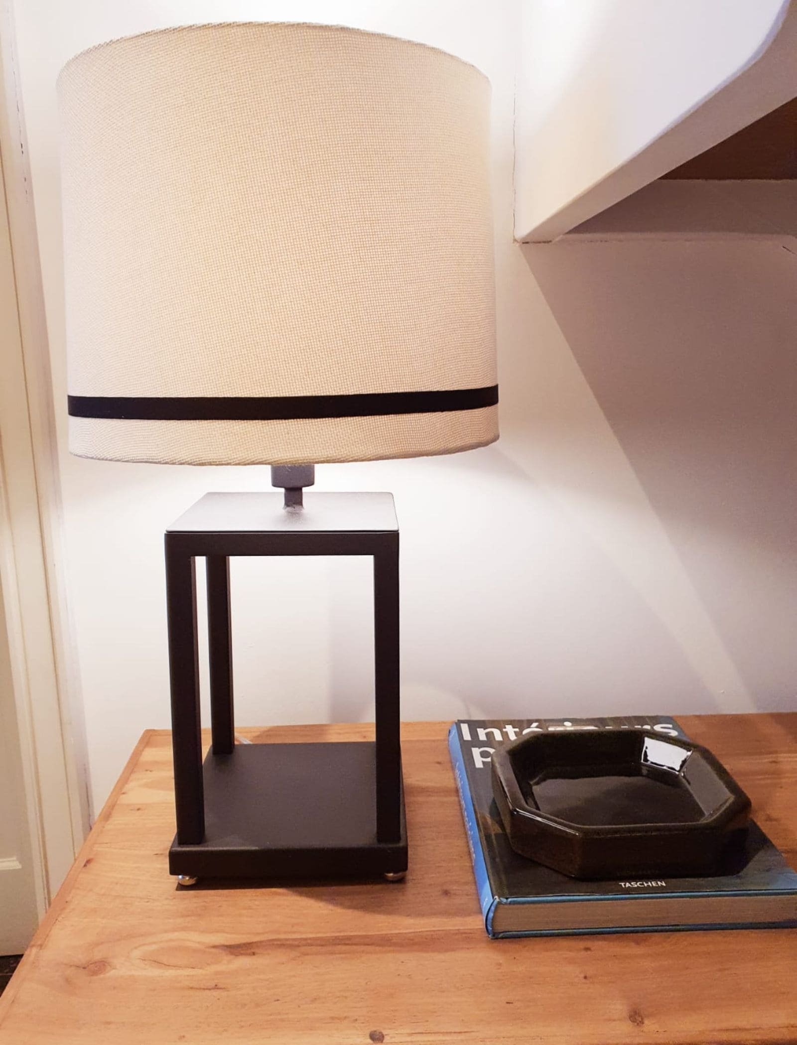 Estrutura em ferro com acabamento especial. Cúpula em tecido rústico.