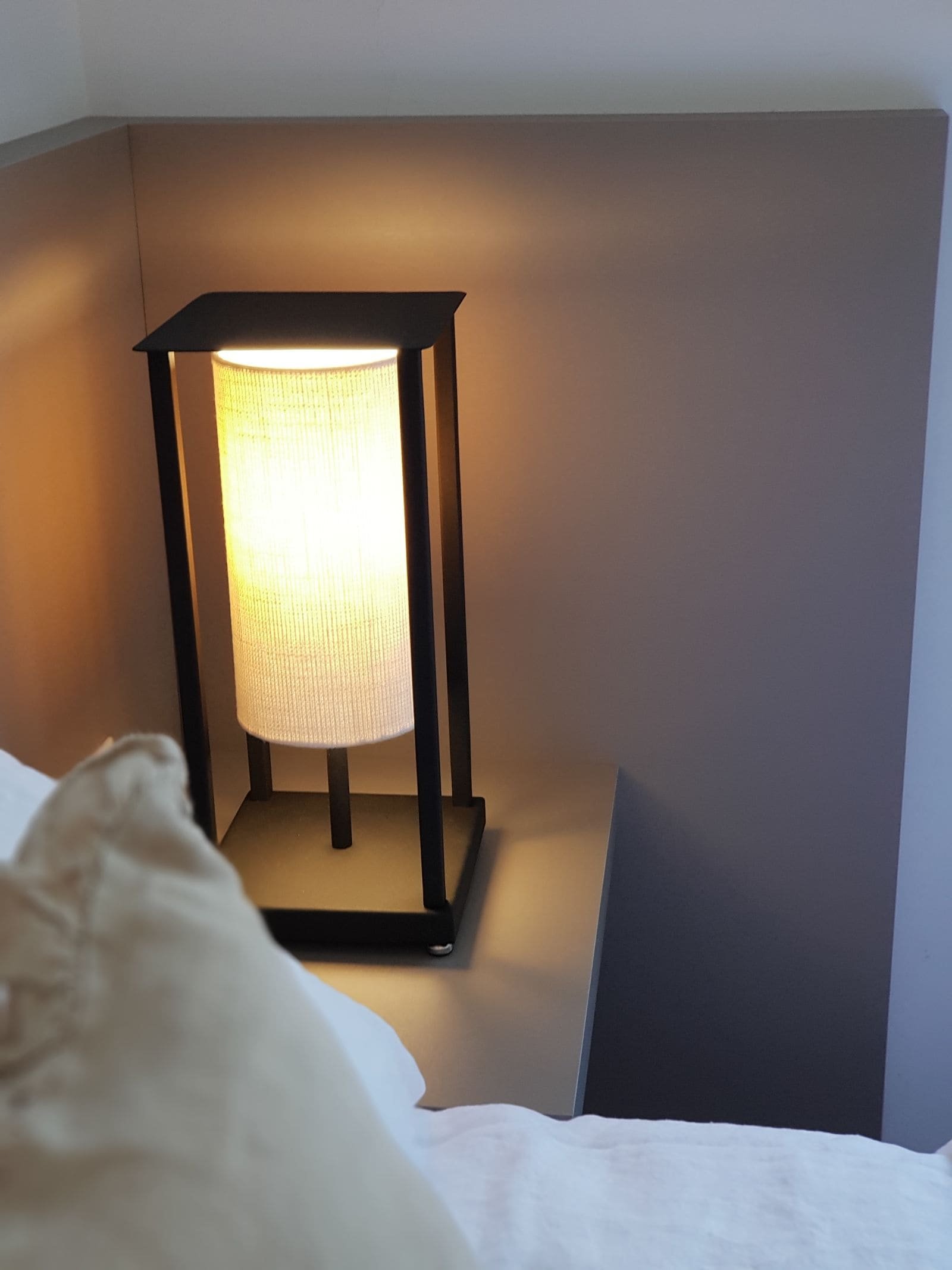 Estrutura caixa em ferro com acabamento especial. Cúpula em tecido rústico.