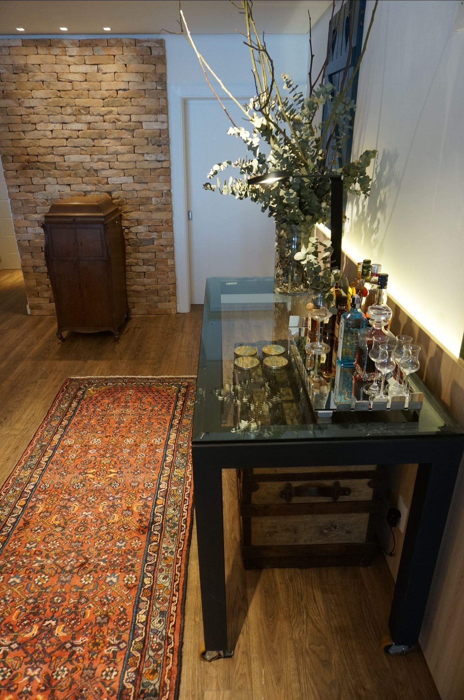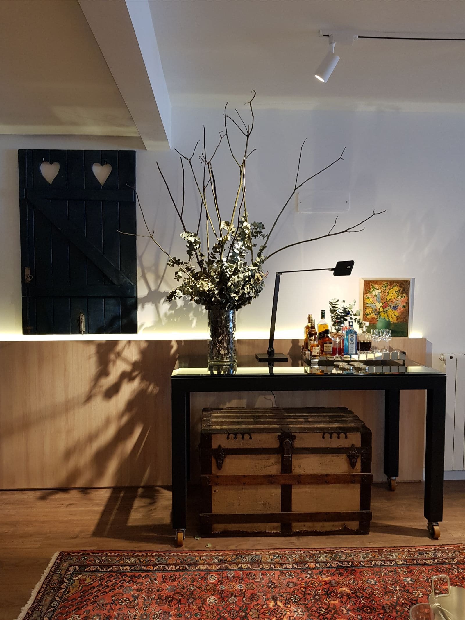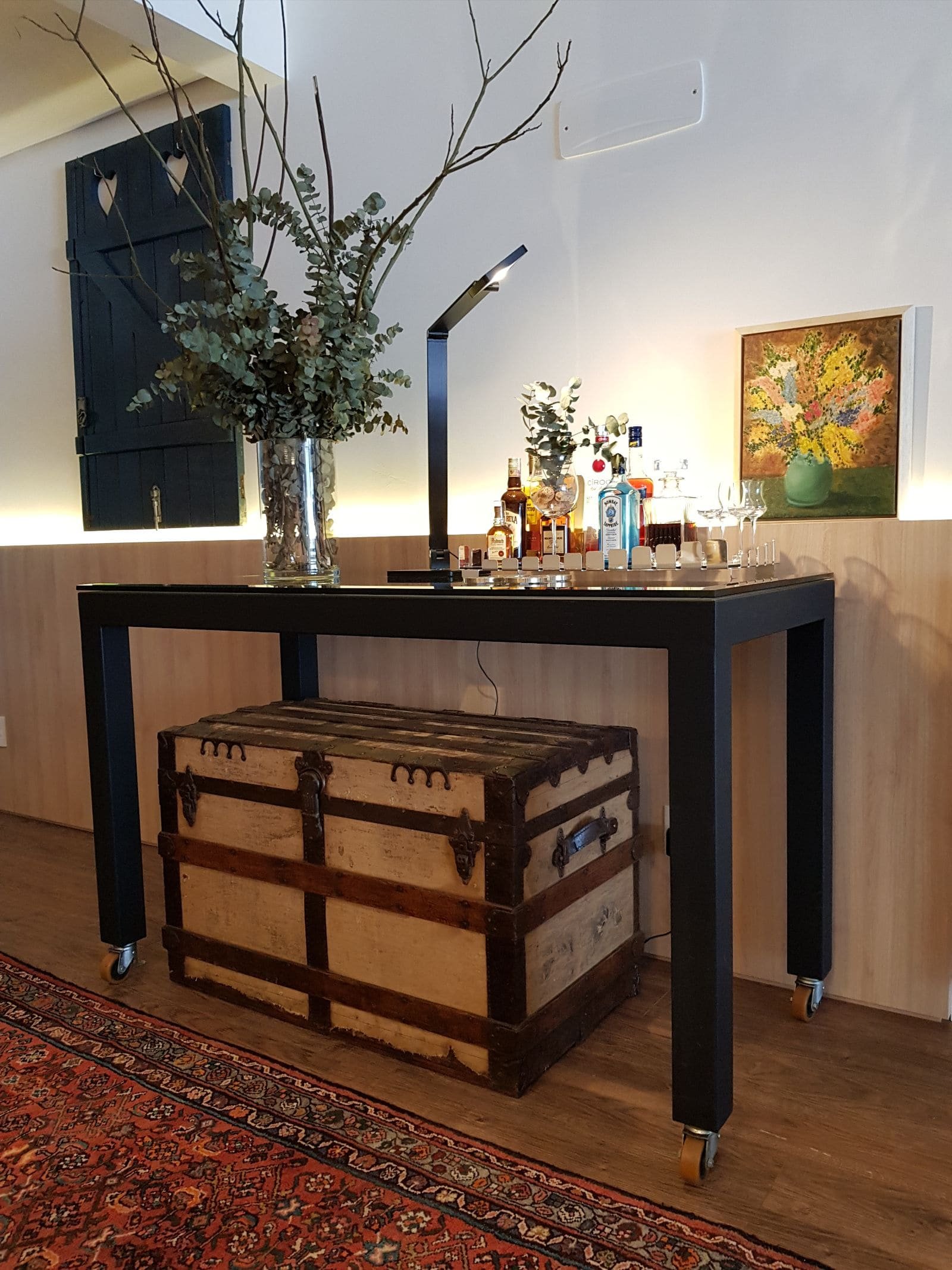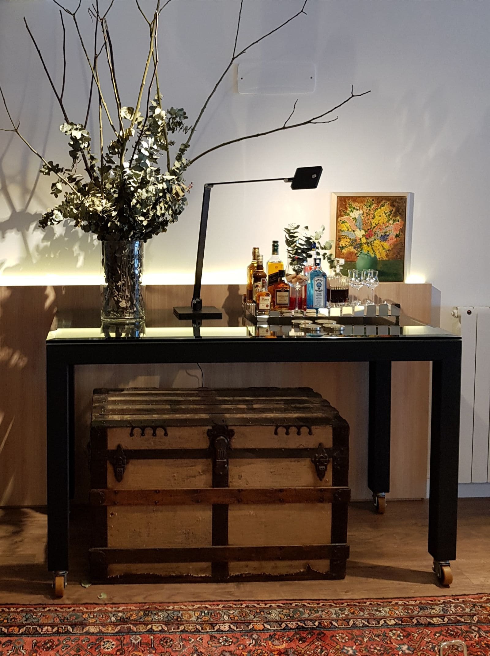 Estrutura em ferro com acabamento especial, c/ ou s/ rodízios. Tampo sobreposto, em vidro ou madeira (a consultar).