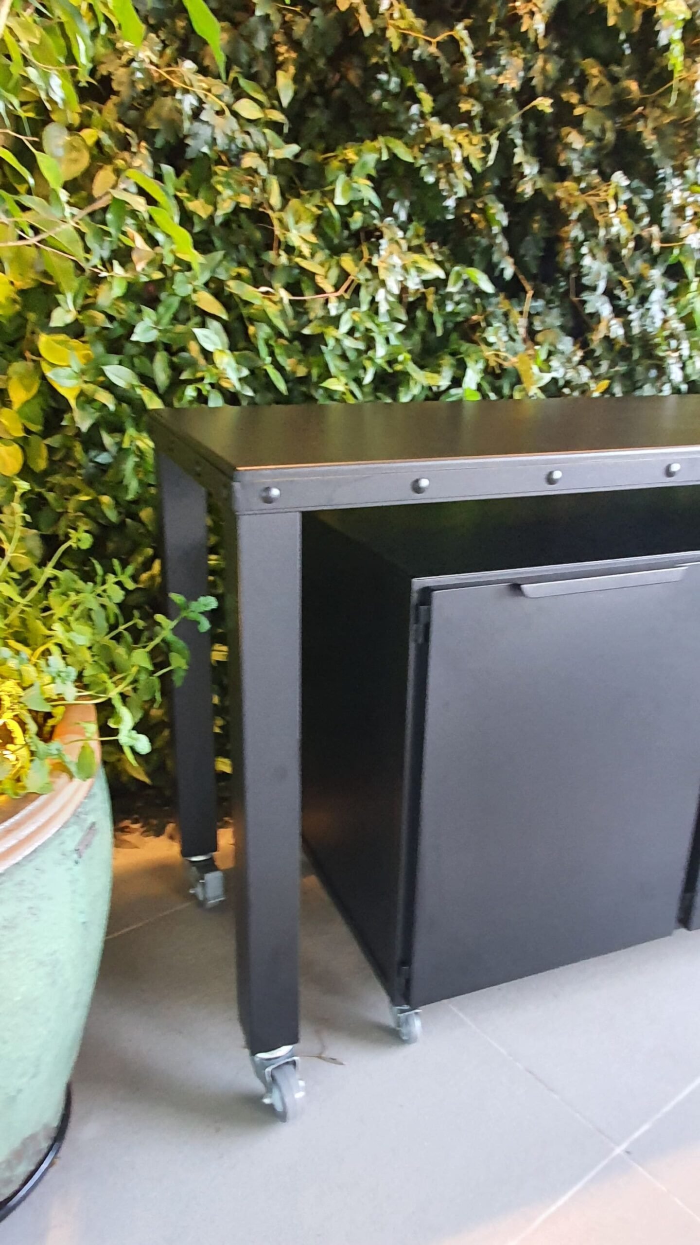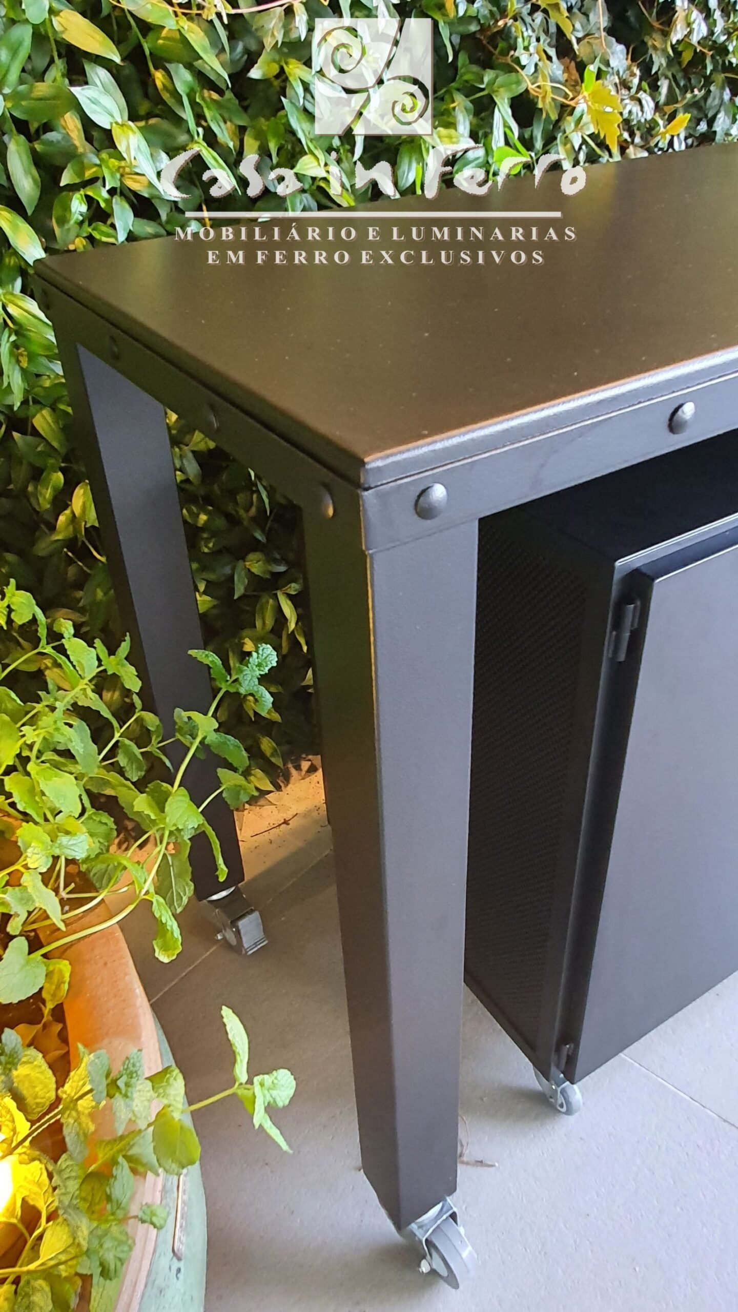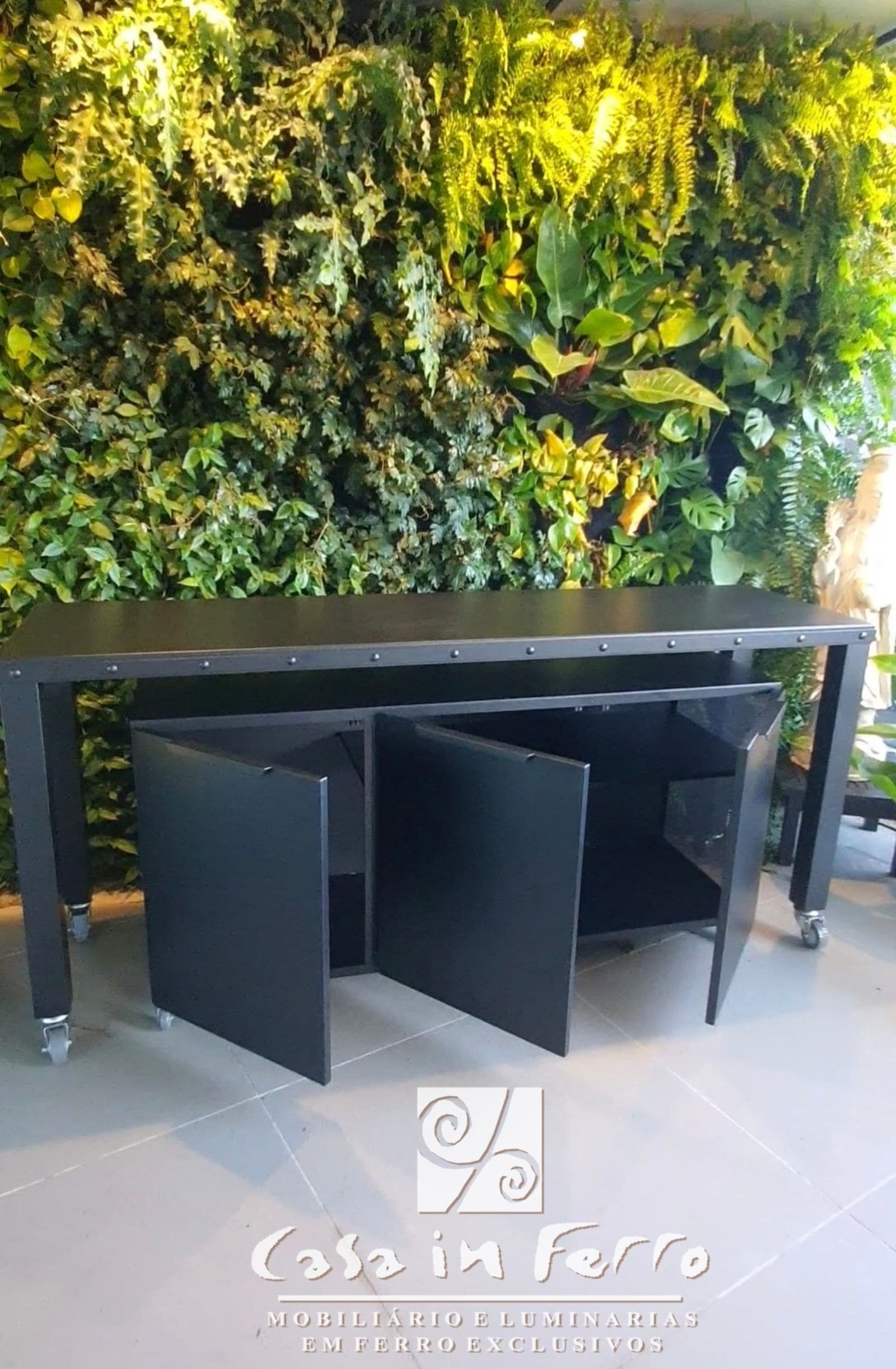 Estrutura em ferro com rodízios, tampo em chapa de ferro, pintura com acabamento especial para áreas externas (com ou sem armário-módulo inferior).