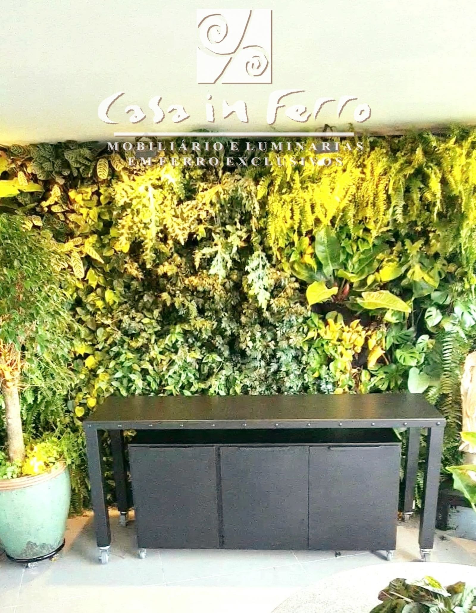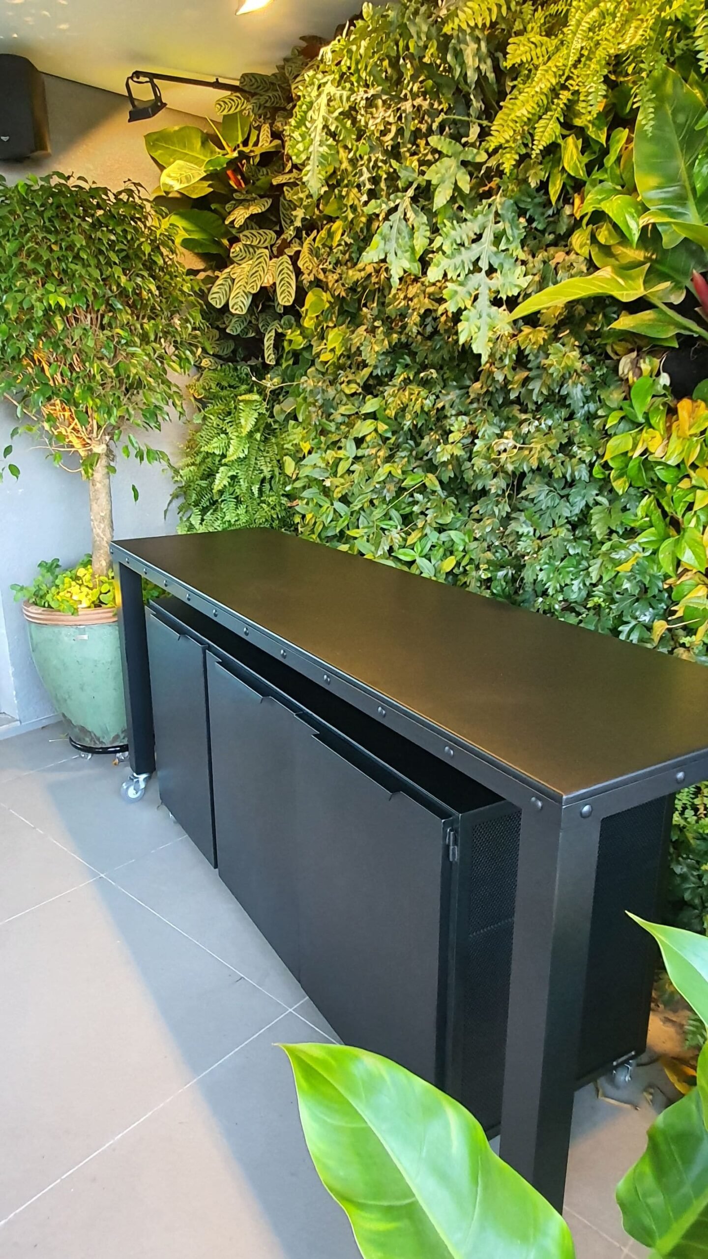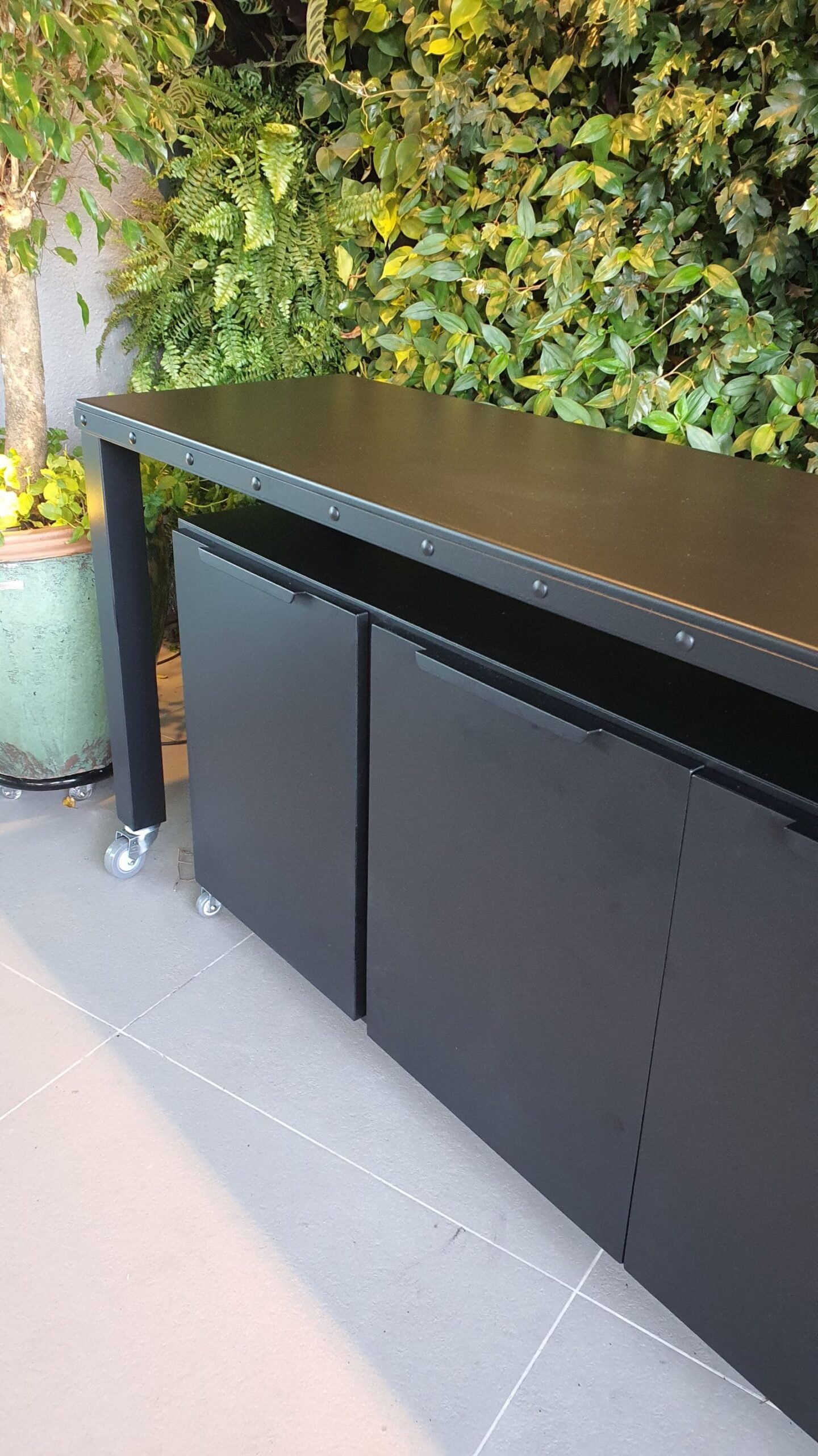 Estrutura em ferro com rodízios, tampo em chapa de ferro, pintura com acabamento especial para áreas externas (com ou sem armário-módulo inferior).