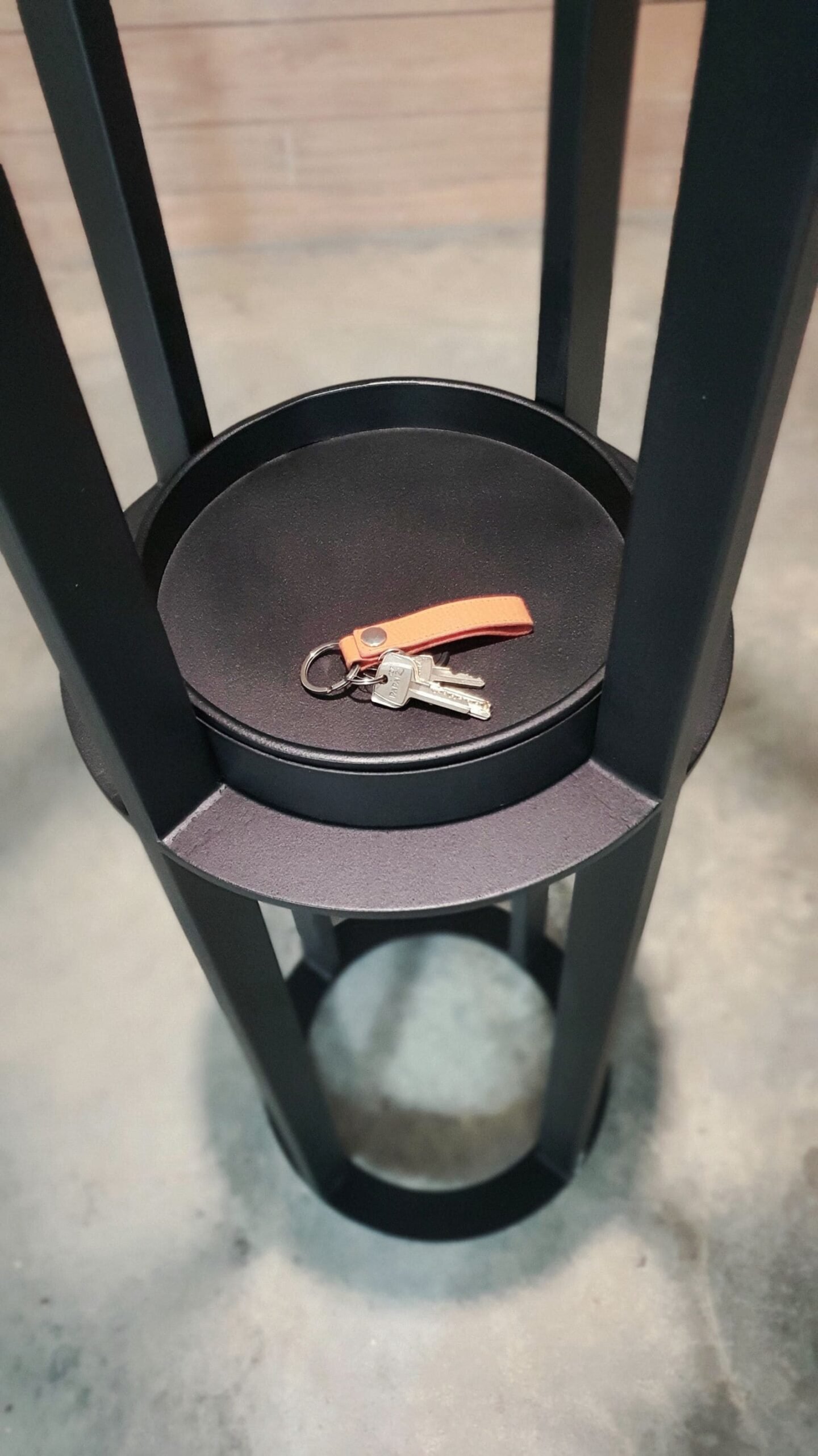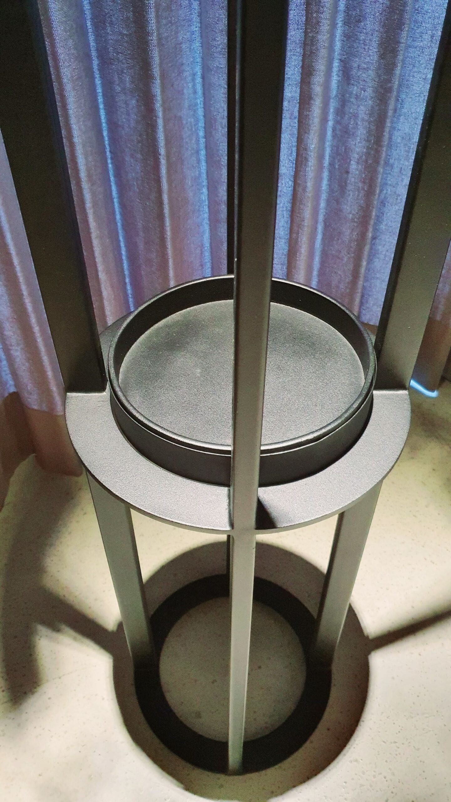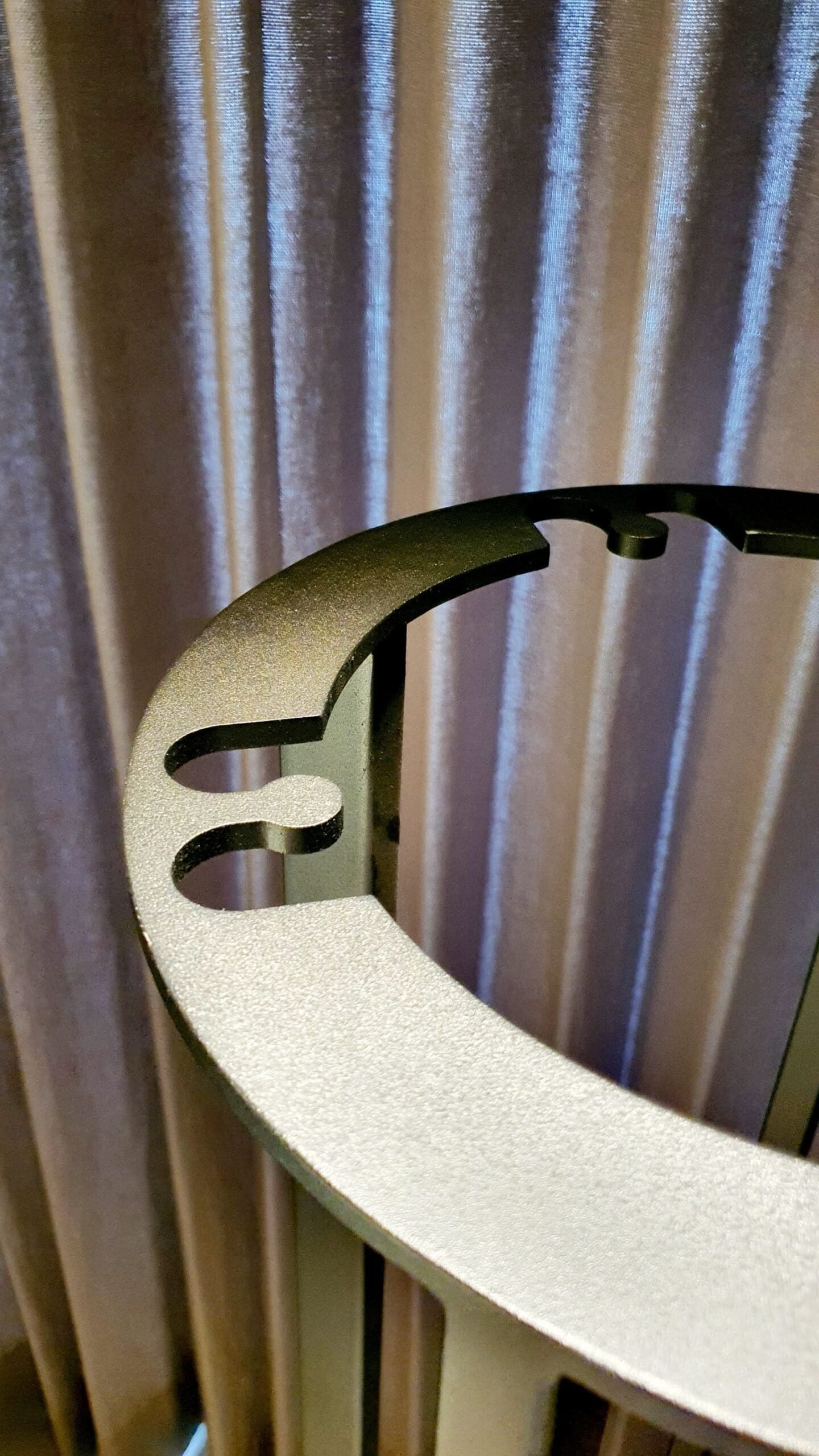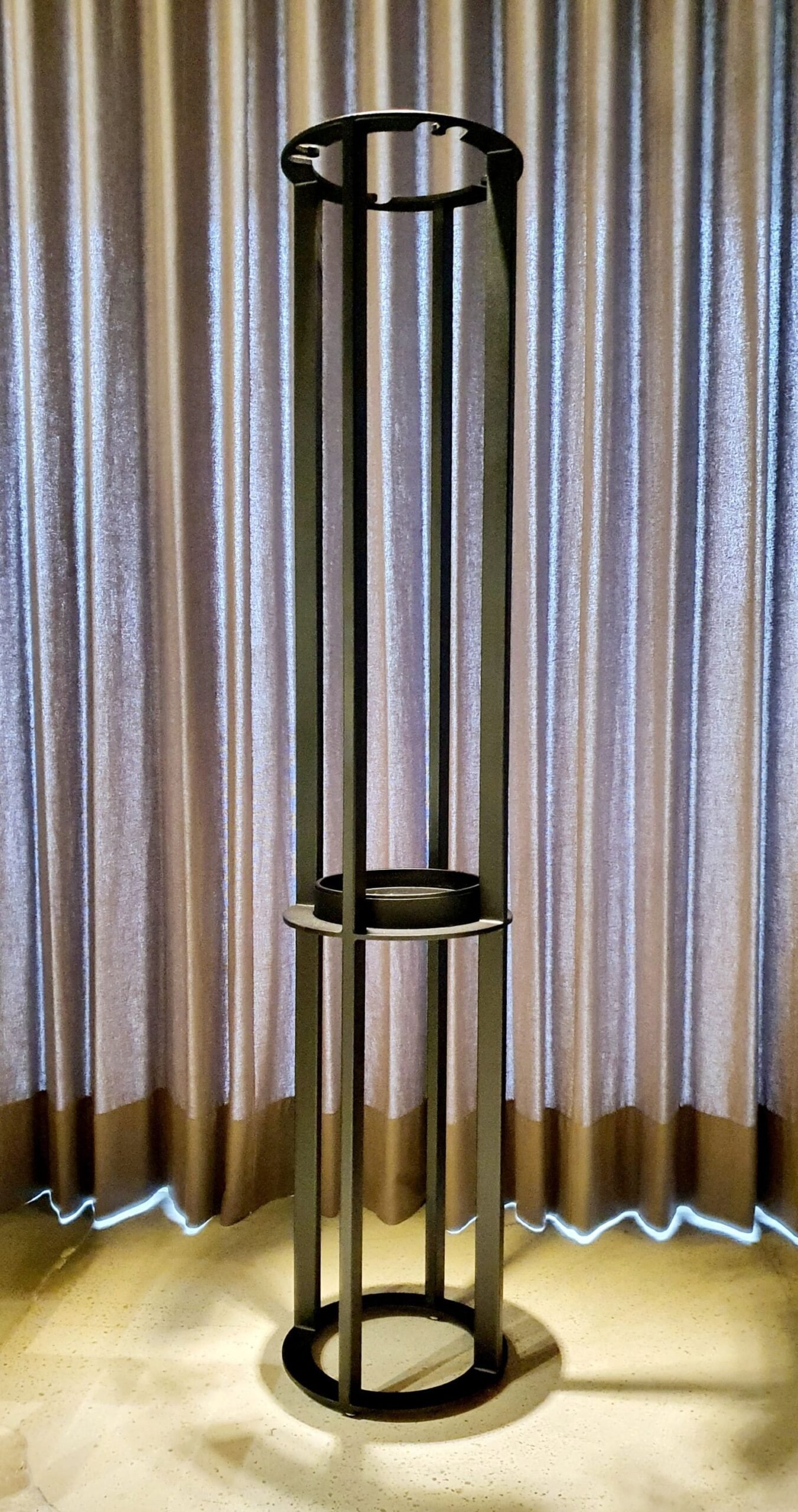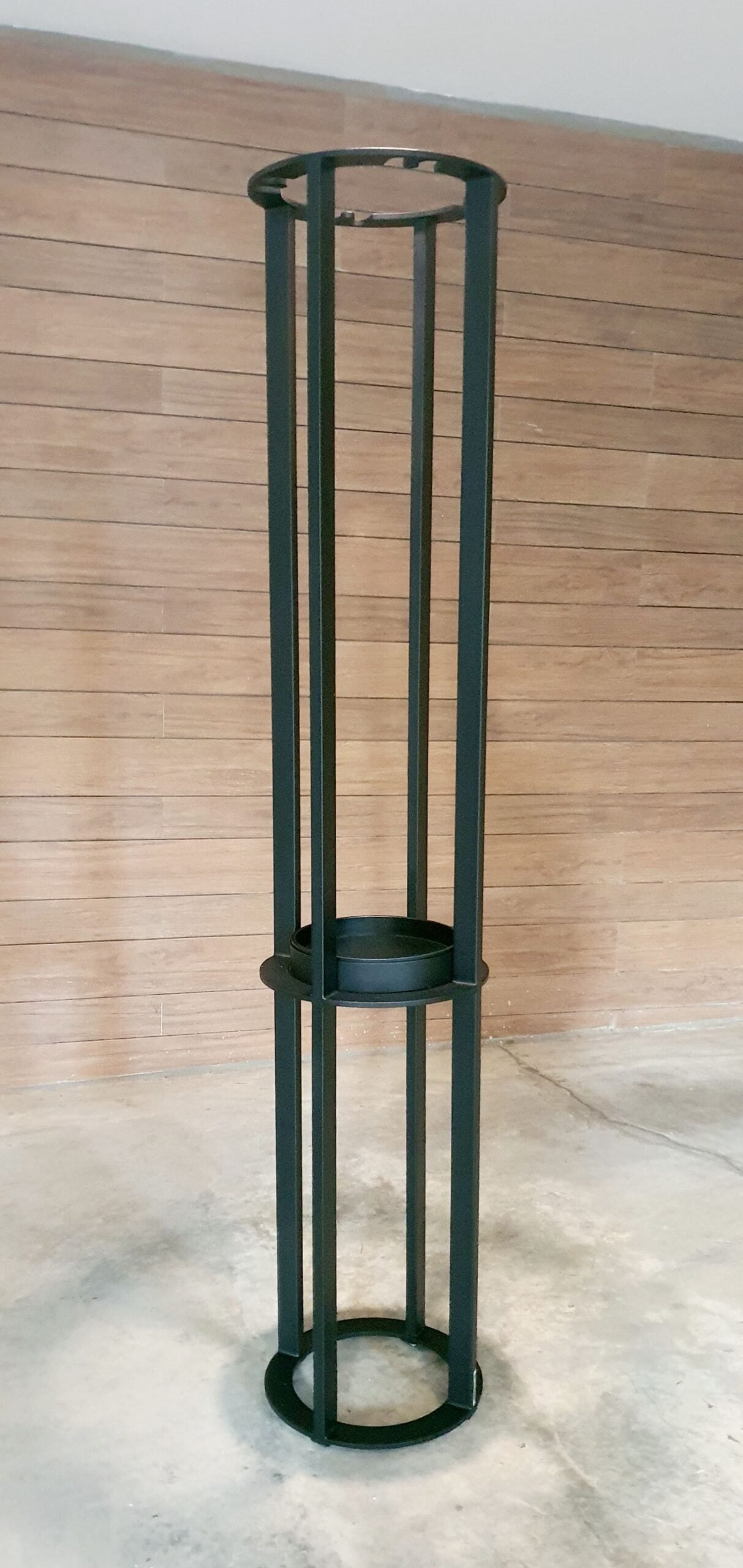 Estrutura em ferro maciço, com chapa recortada e sapatas inferiores; pintura acabamento especial.