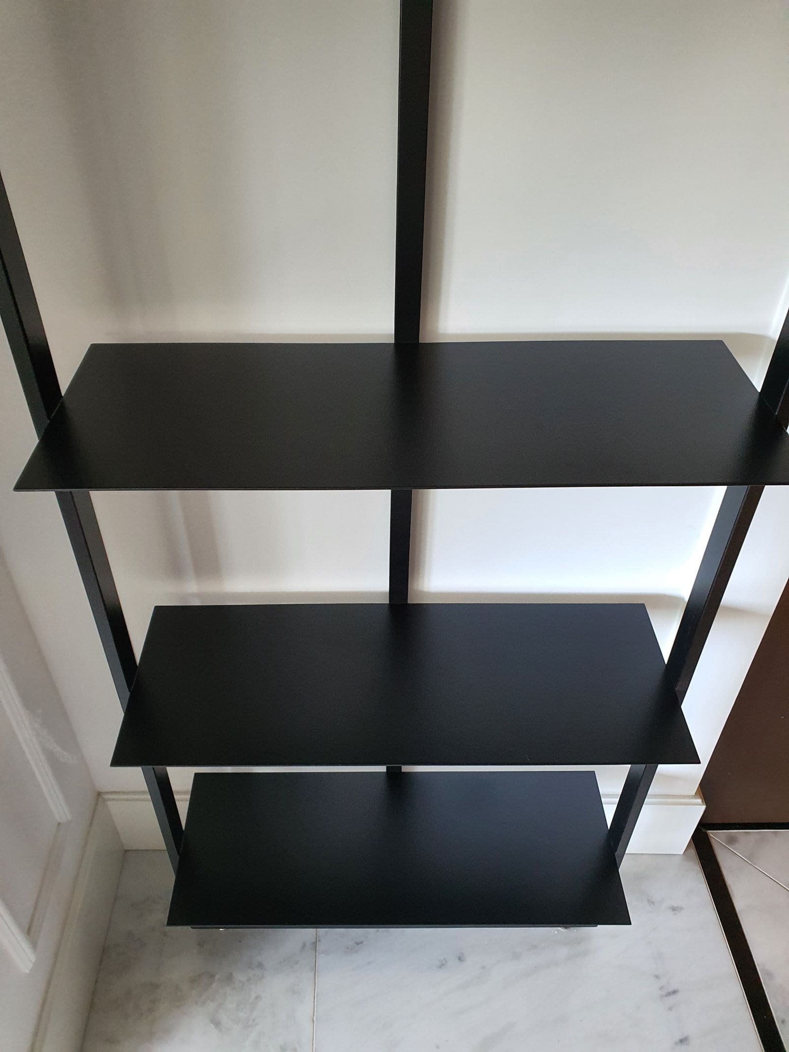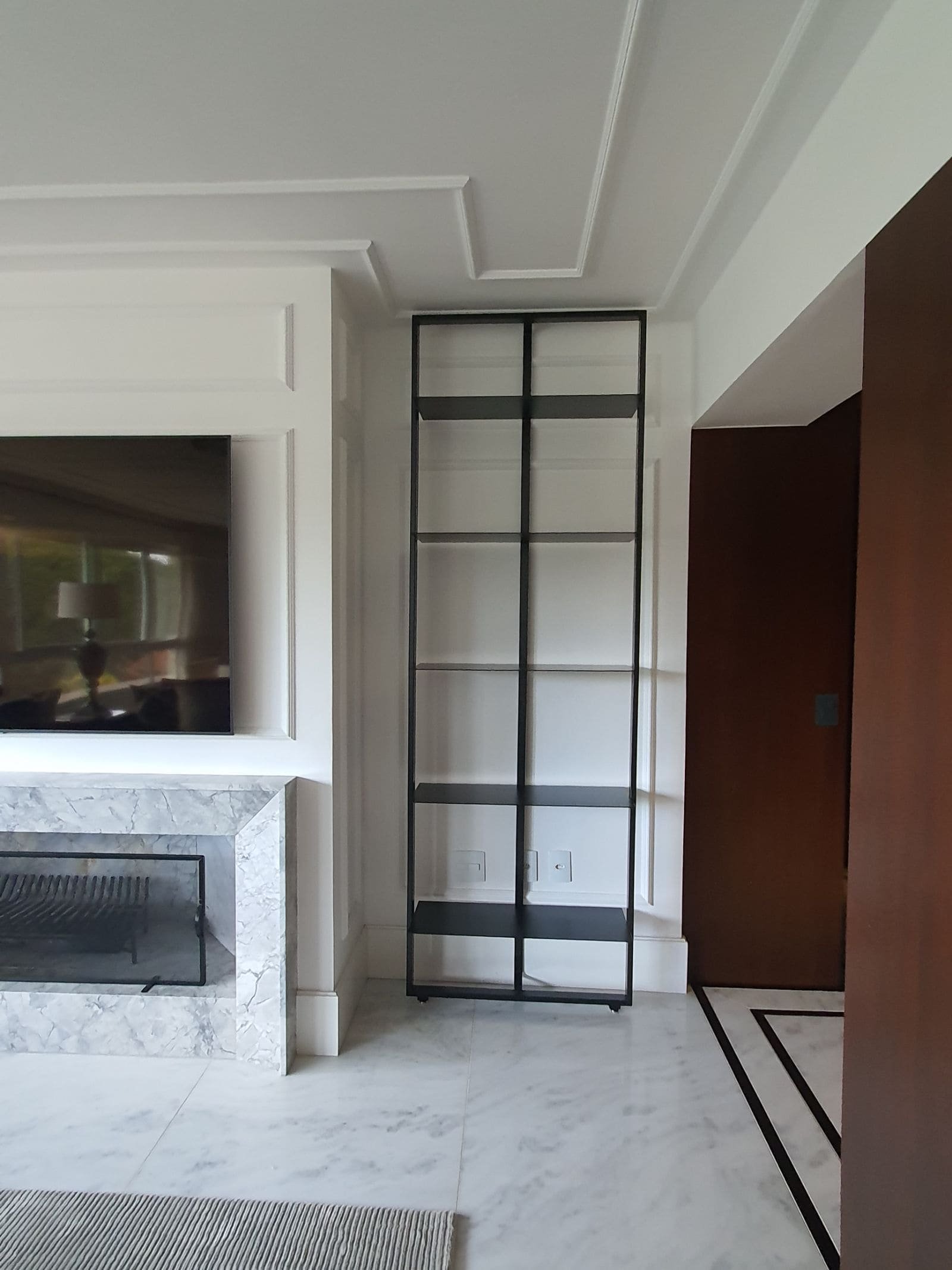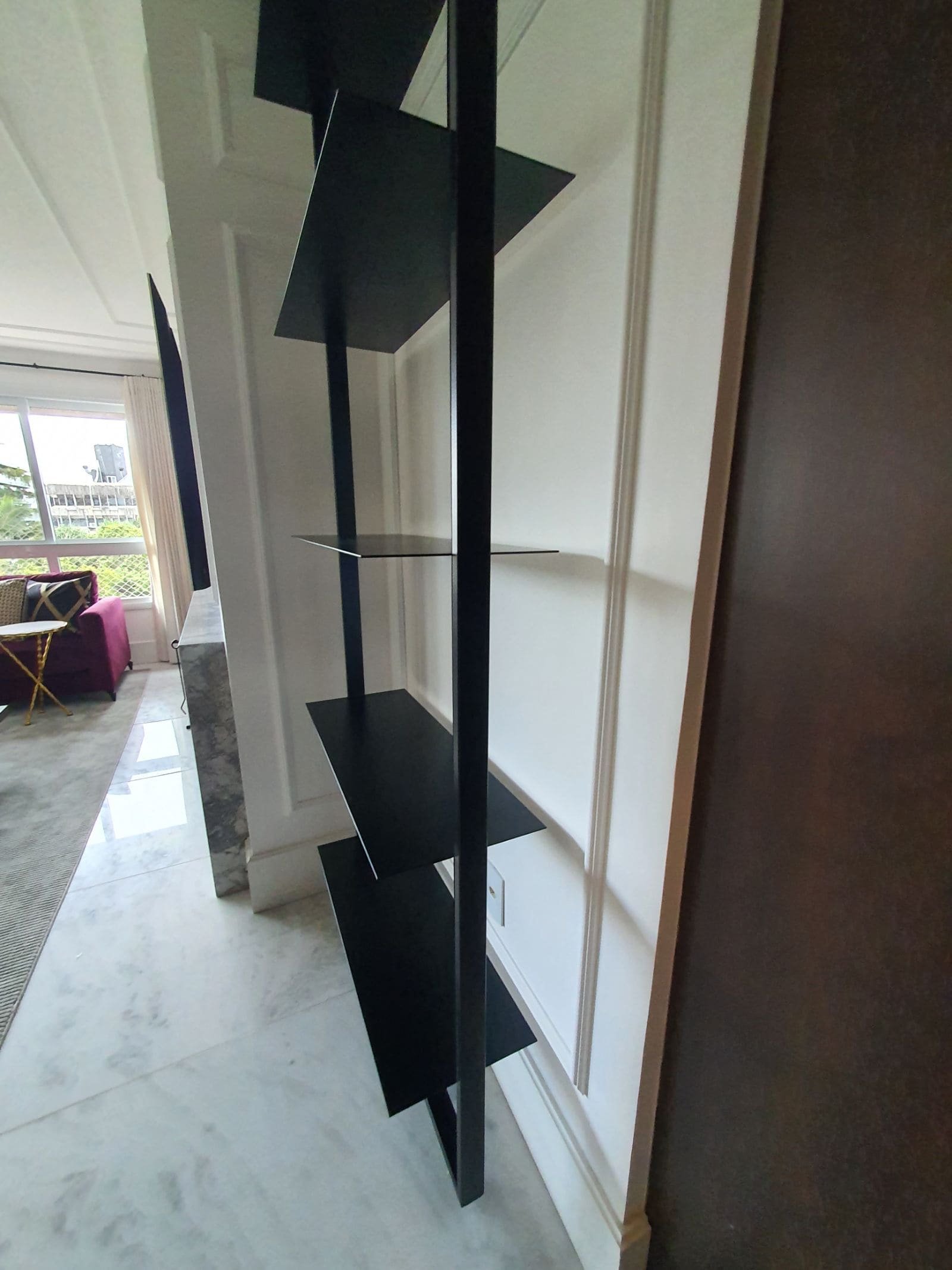 Estrutura em ferro, estantes em chapa ferro maciço, pintura especial. Dimensões sob medida.
