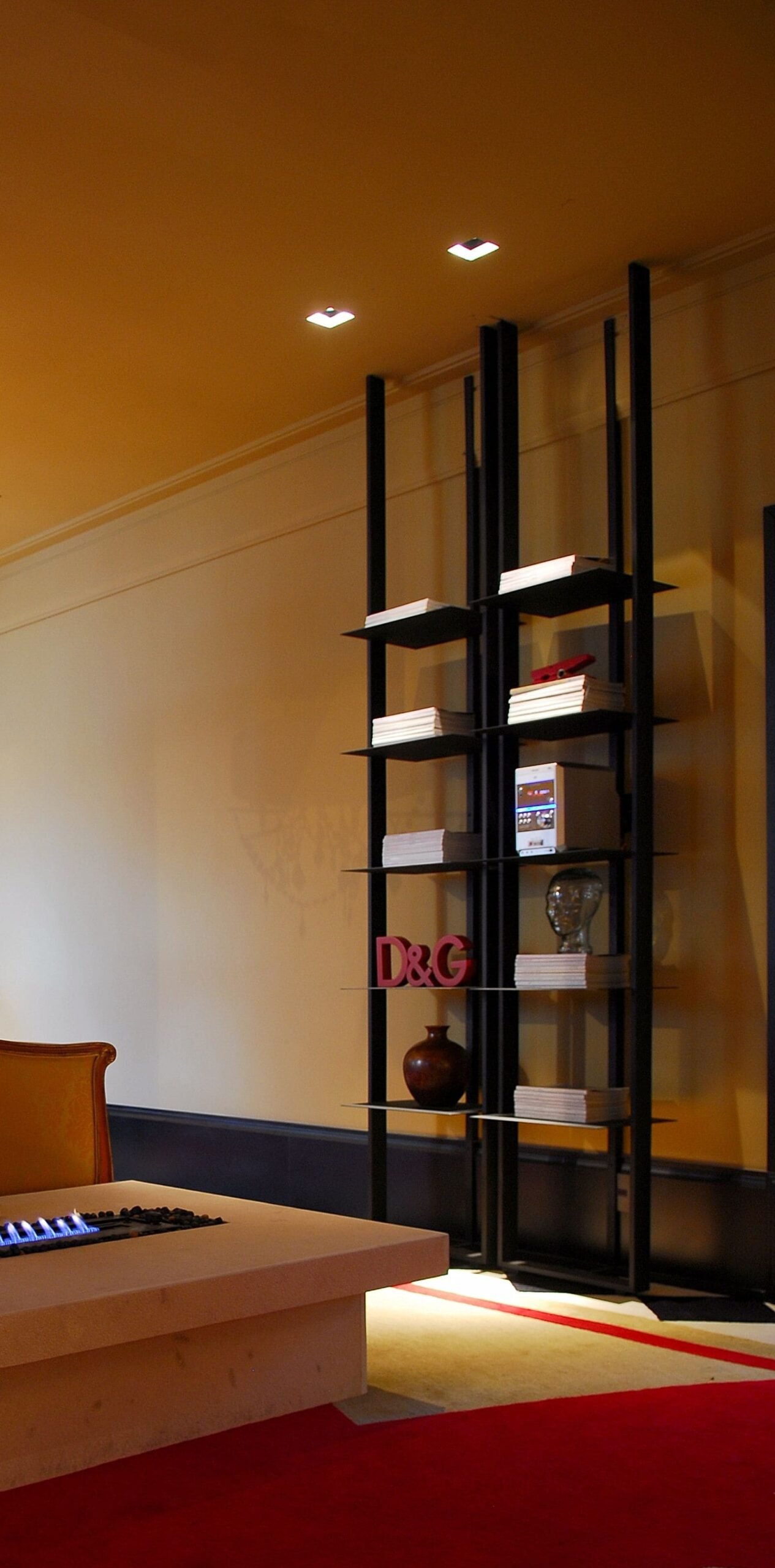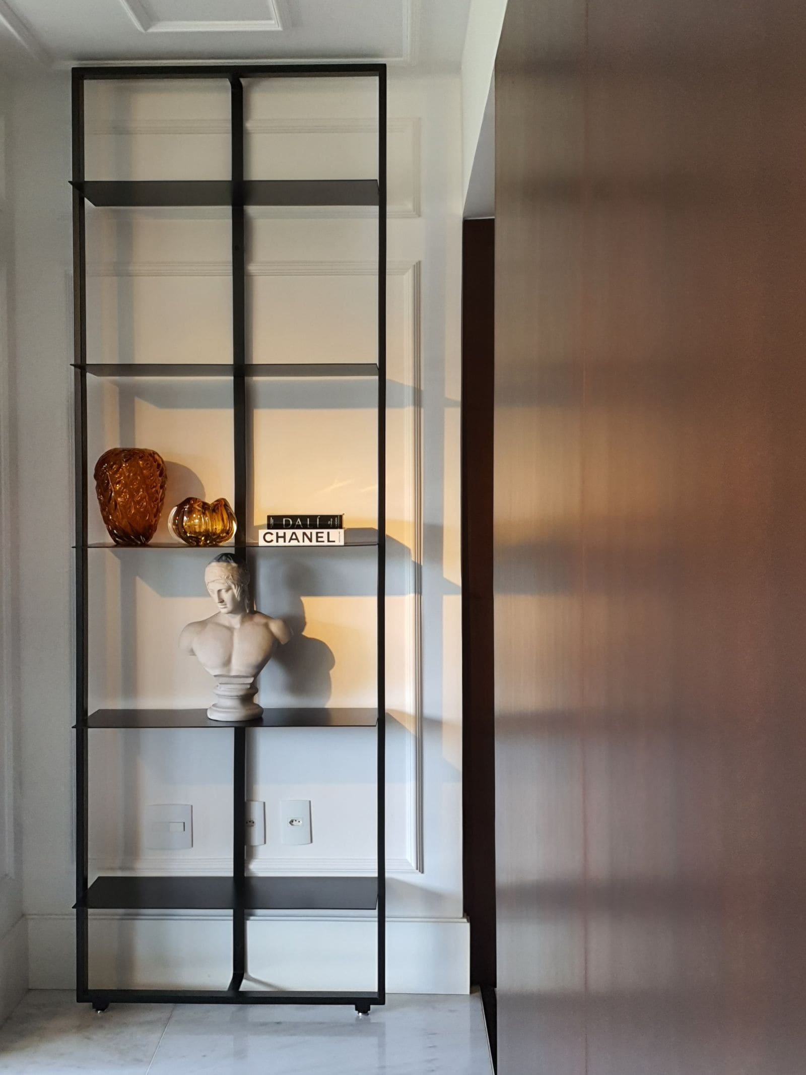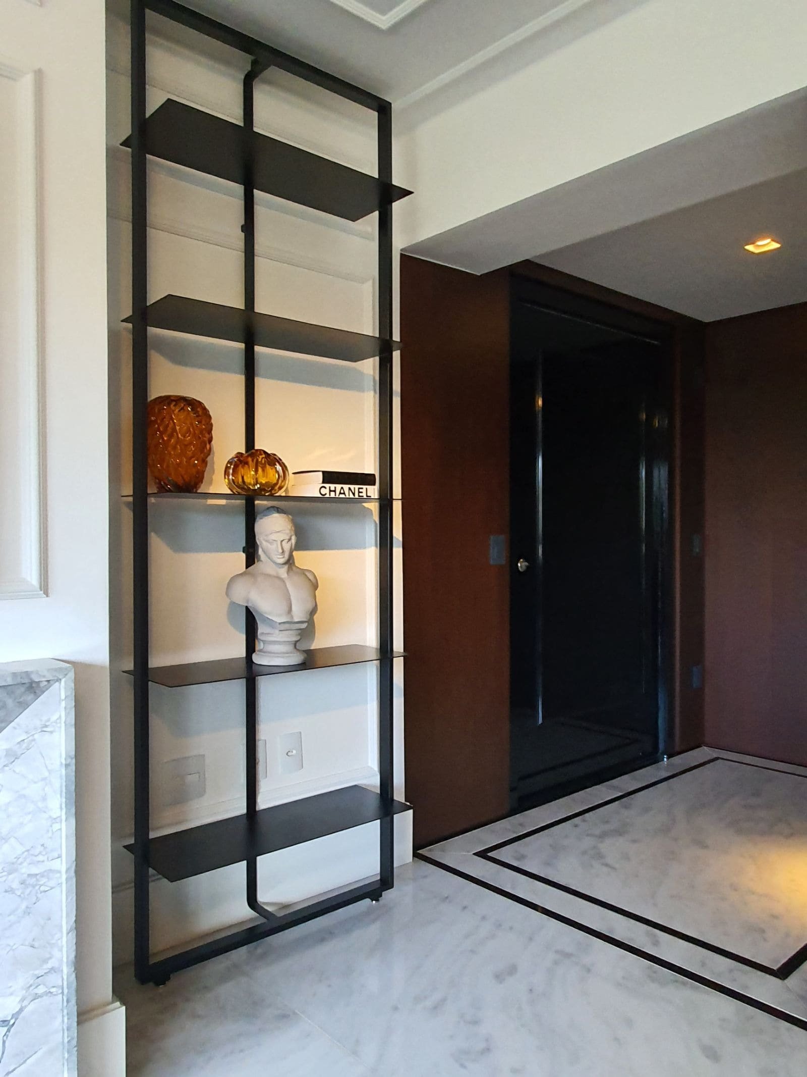 Estrutura em ferro, estantes em chapa ferro maciço, pintura especial. Dimensões sob medida.