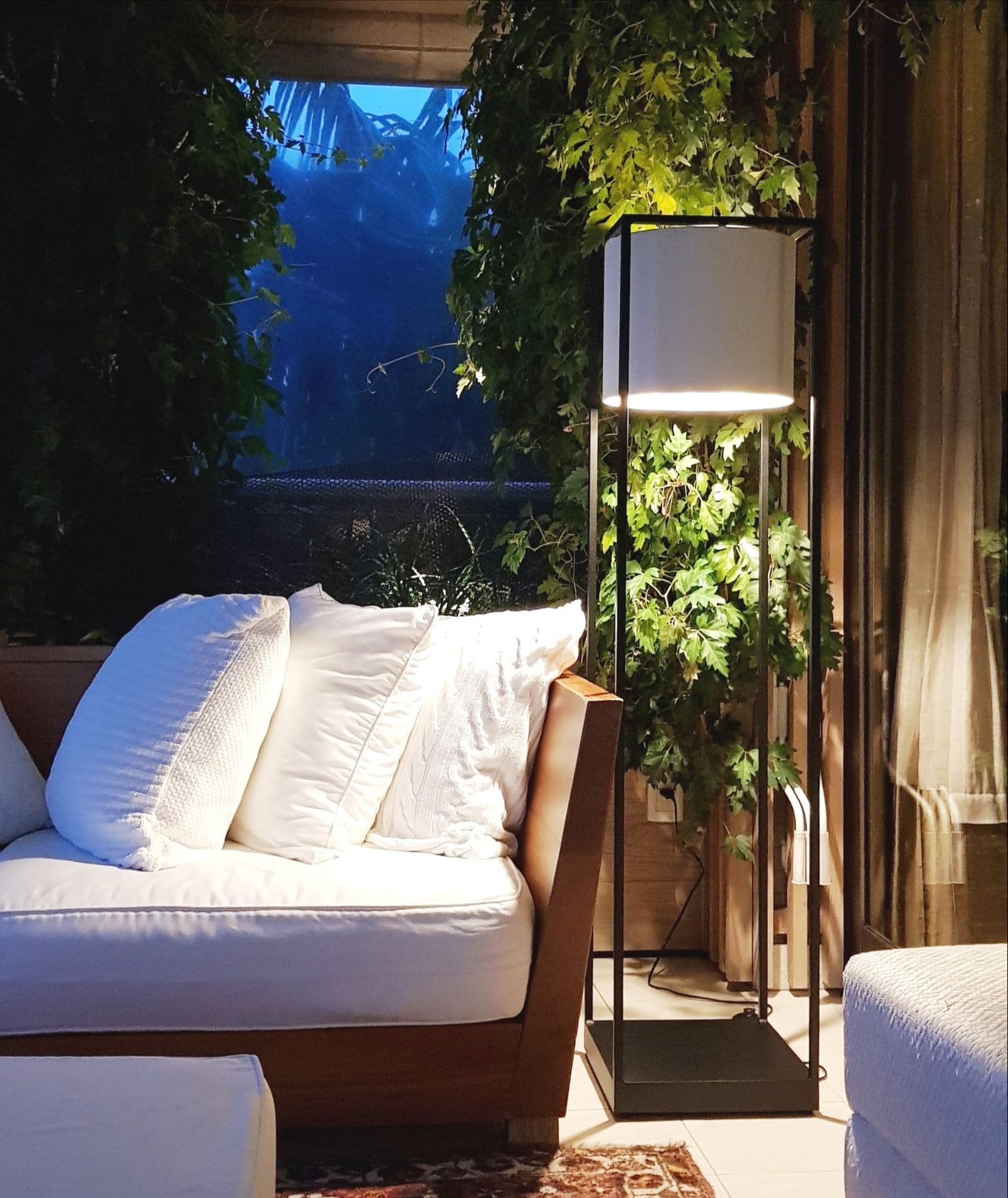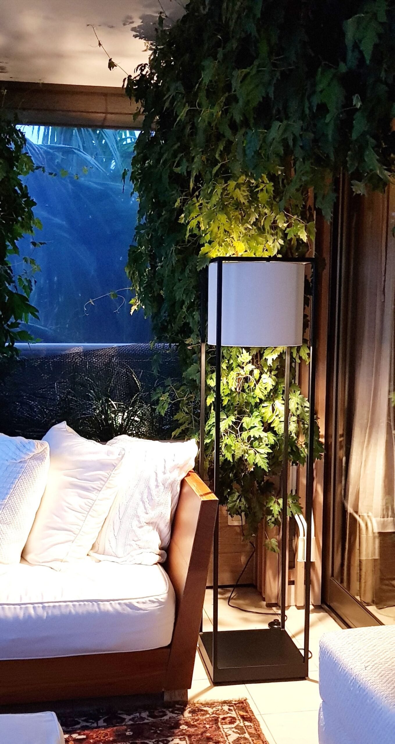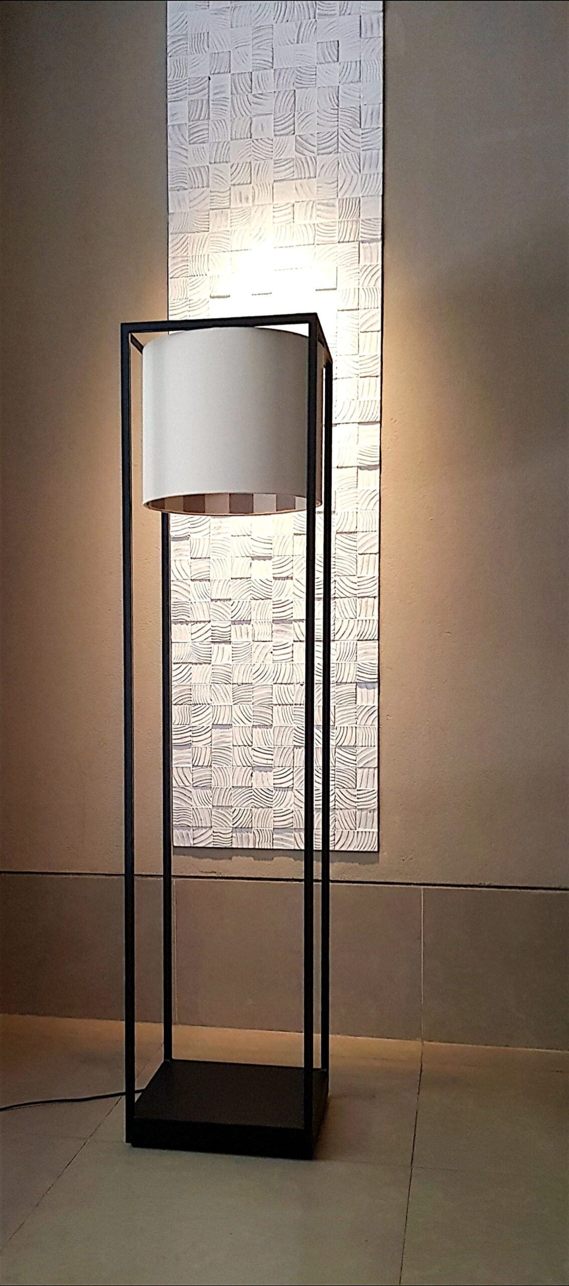 Estrutura chapa em ferro, acabamento especial. Cúpula em tecido rústico nobre.