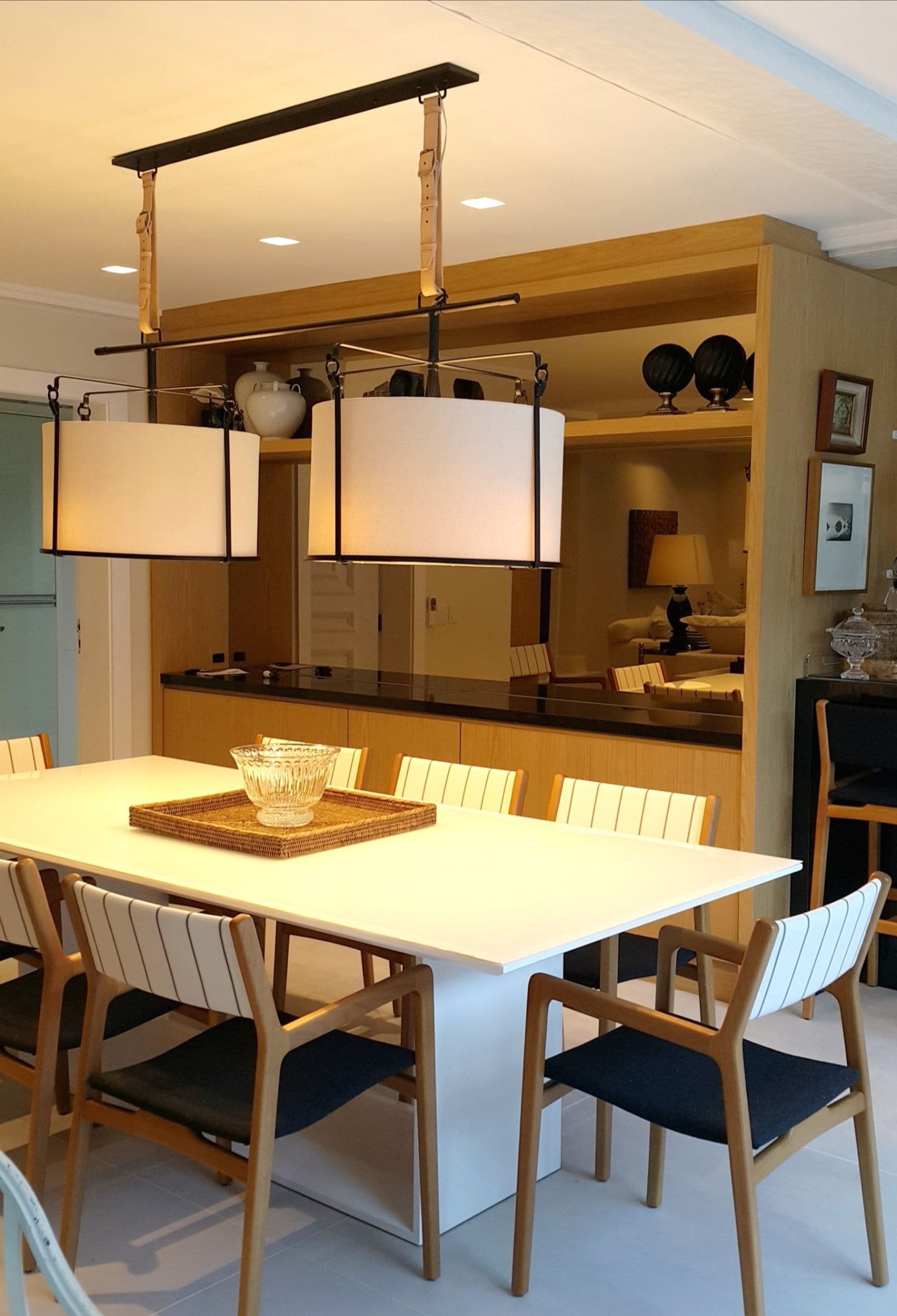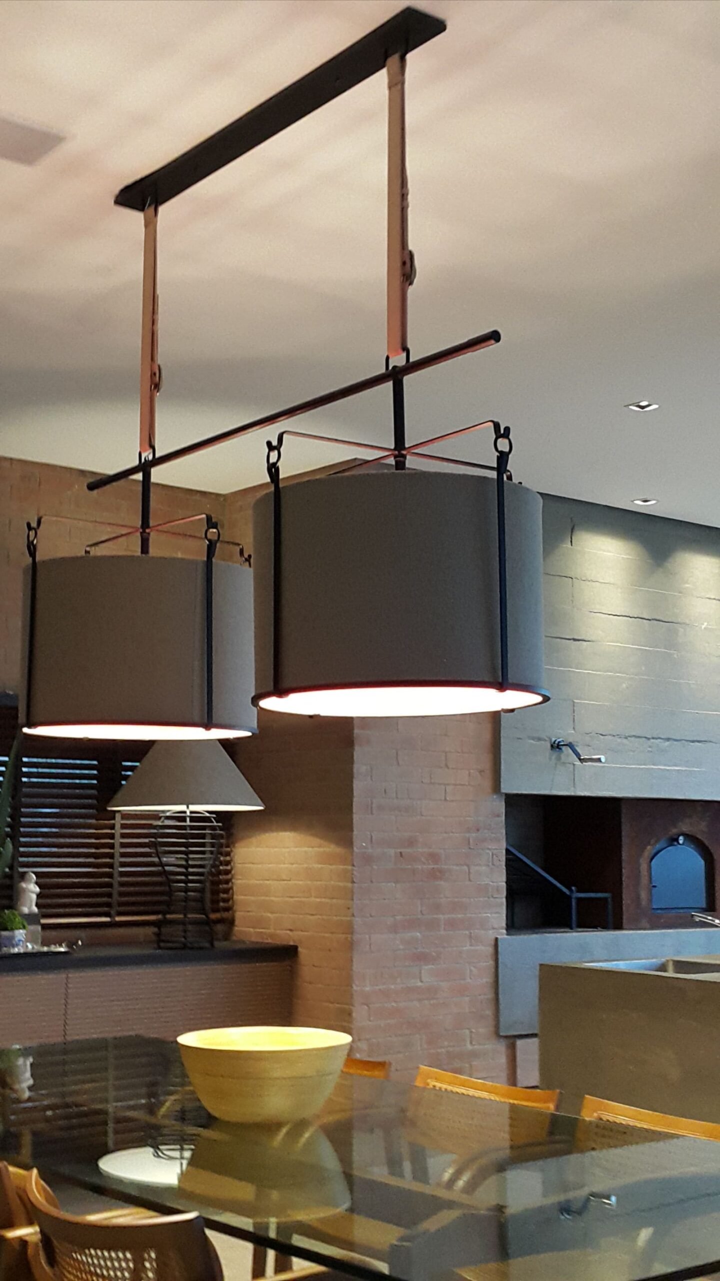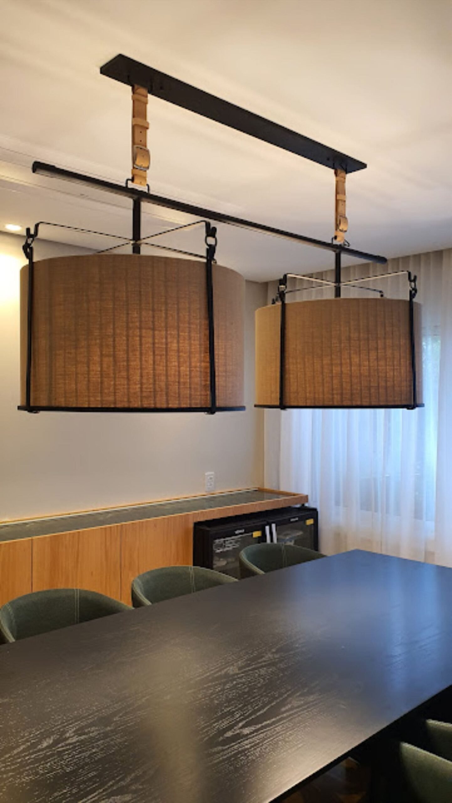 Estrutura e detalhes em ferro e couro natural. Cúpula em tecido nobre rústico. Acabamento pintura especial.