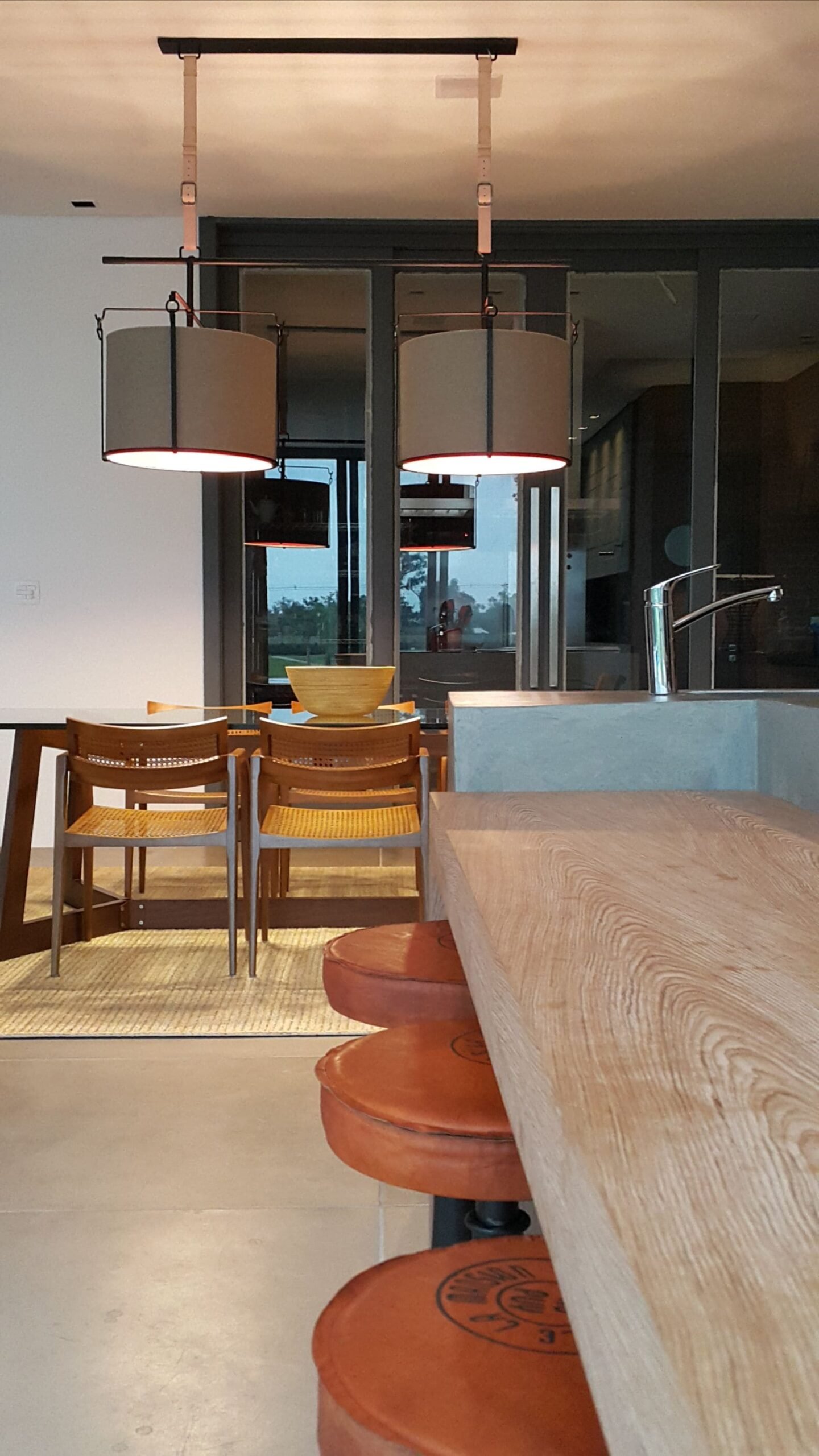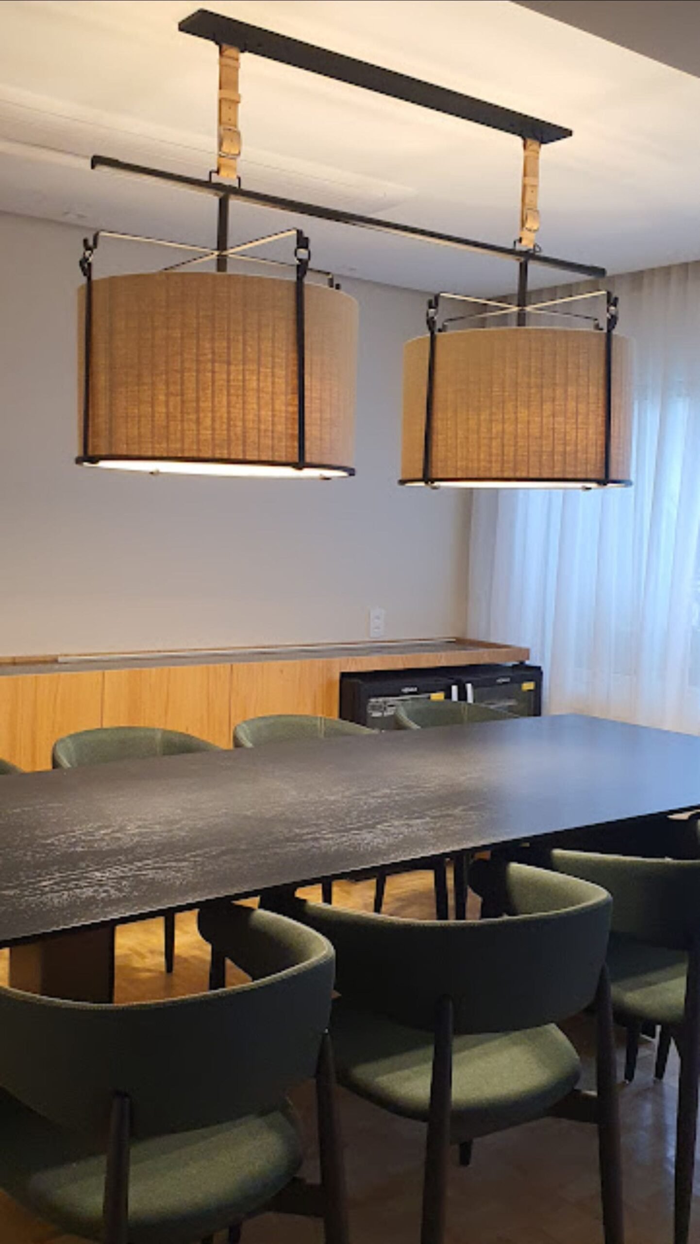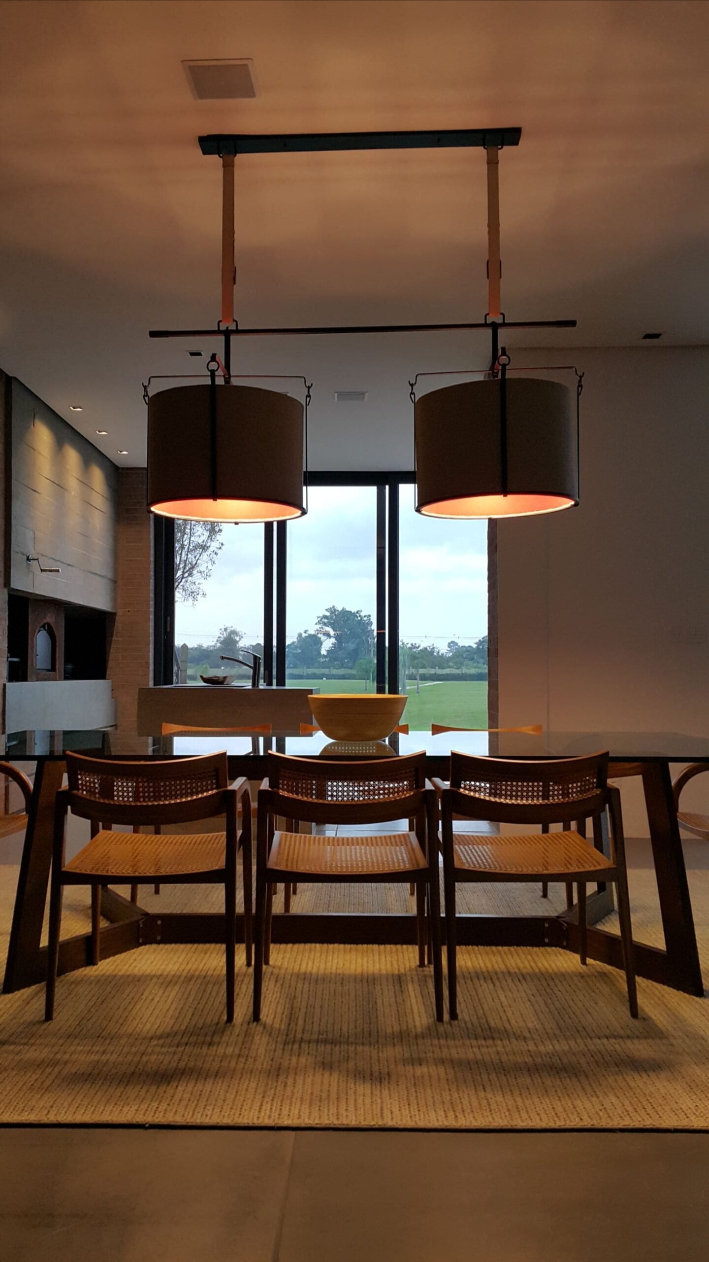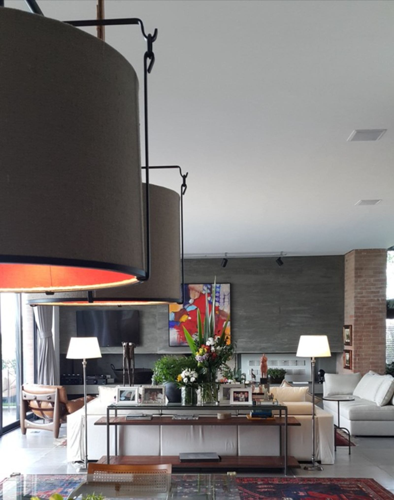 Estrutura e detalhes em ferro e couro natural. Cúpula em tecido nobre rústico. Acabamento pintura especial.