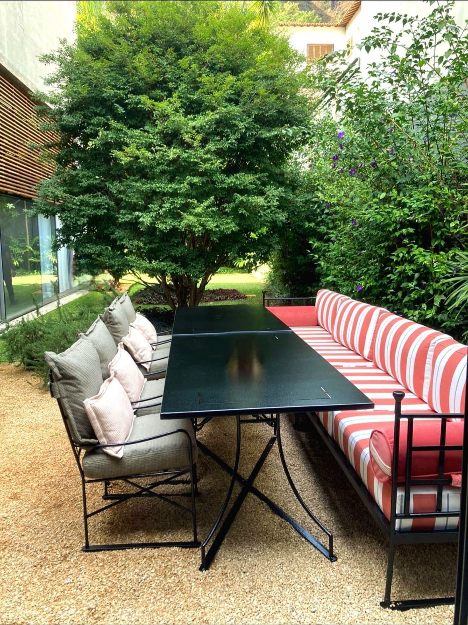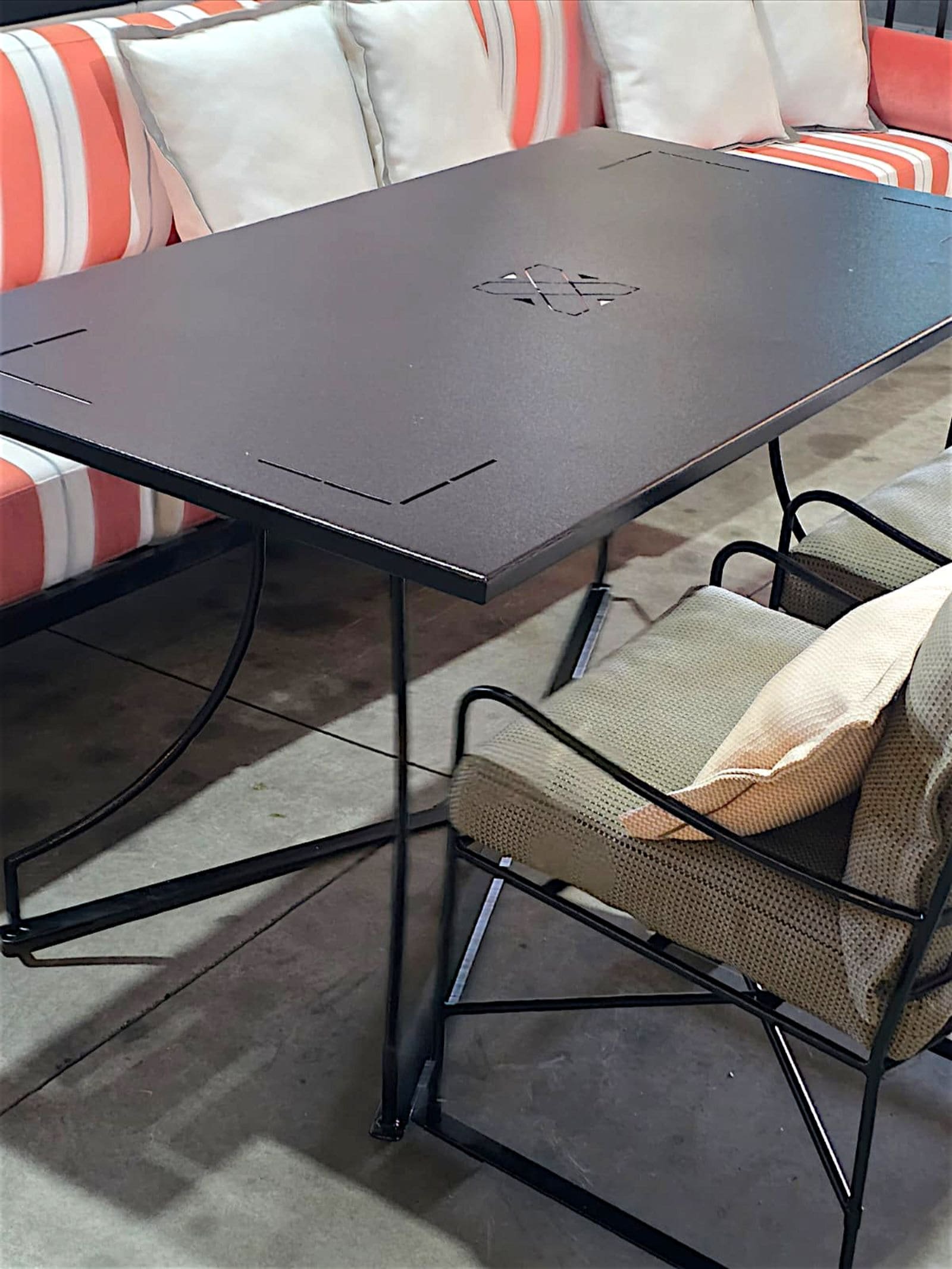 Mesa de jantar estrutura em ferro maciço, tampo em chapa c/ recorte em laser, acabamento especial para áreas externas.